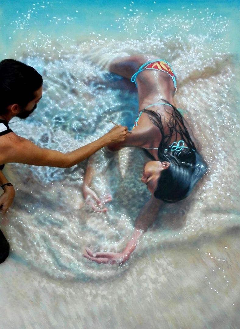 Y explicó que “una vez escogida la imagen paso a hacerla a mano alzada en el lienzo en blanco con lápiz, trazando las líneas que me irán diciendo a mi parecer por donde irá la pintura. Luego comienzo a poner la pintura con pincel por capas de colores, en la mayoría de los casos llegan a ser muchísimas capas, para luego empezar con miles de detalles que contienen la imagen. En mis pinturas el secreto está en conocer y comprender los puntos de luz que le dan vida a mis imágenes”.